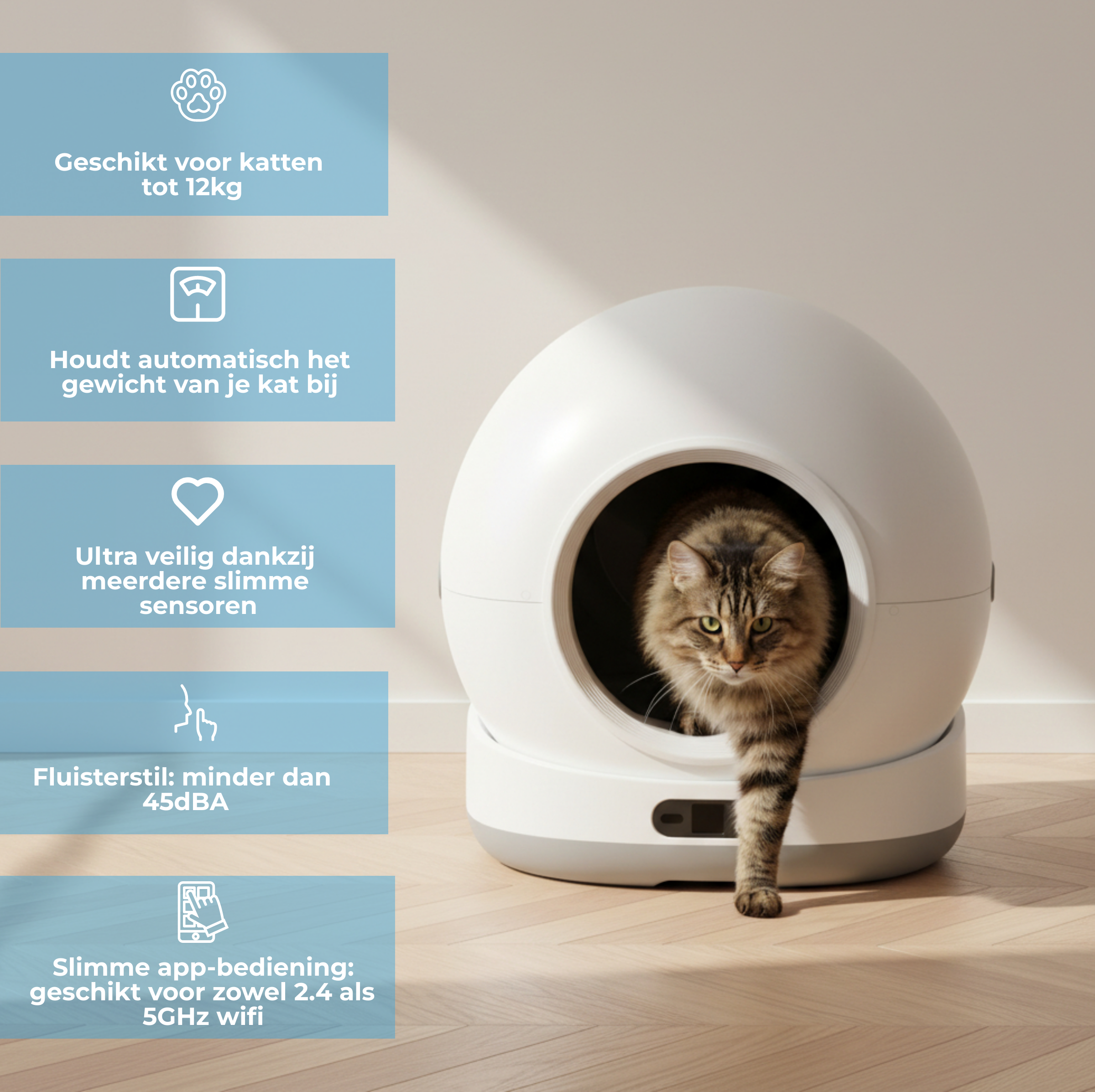 De 360 graden detectie met veiligheidssensoren zorgt dat de reiniging alleen start wanneer je kat veilig op afstand is. Zo staat veiligheid altijd voorop, ook bij nieuwsgierige katten.