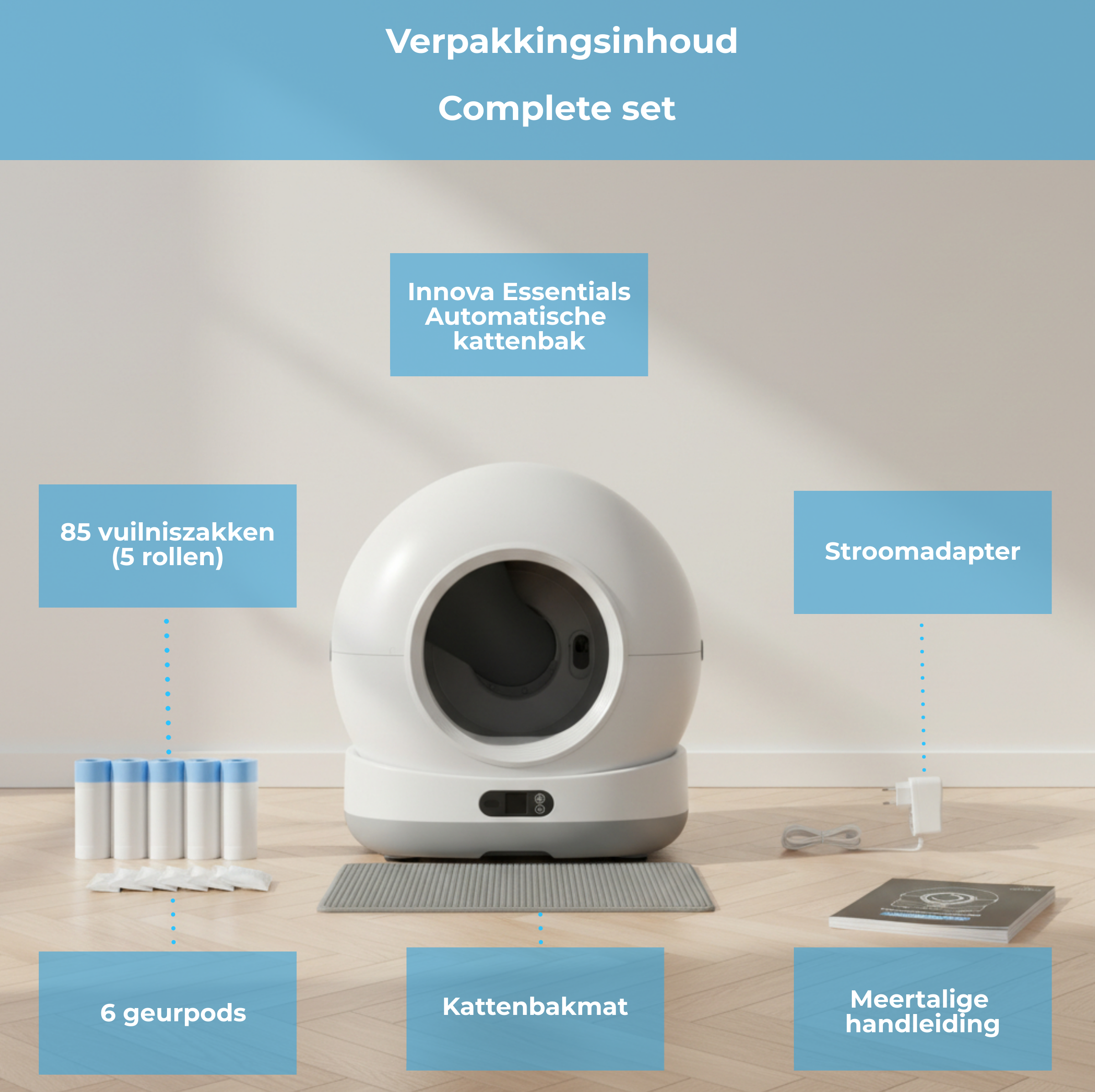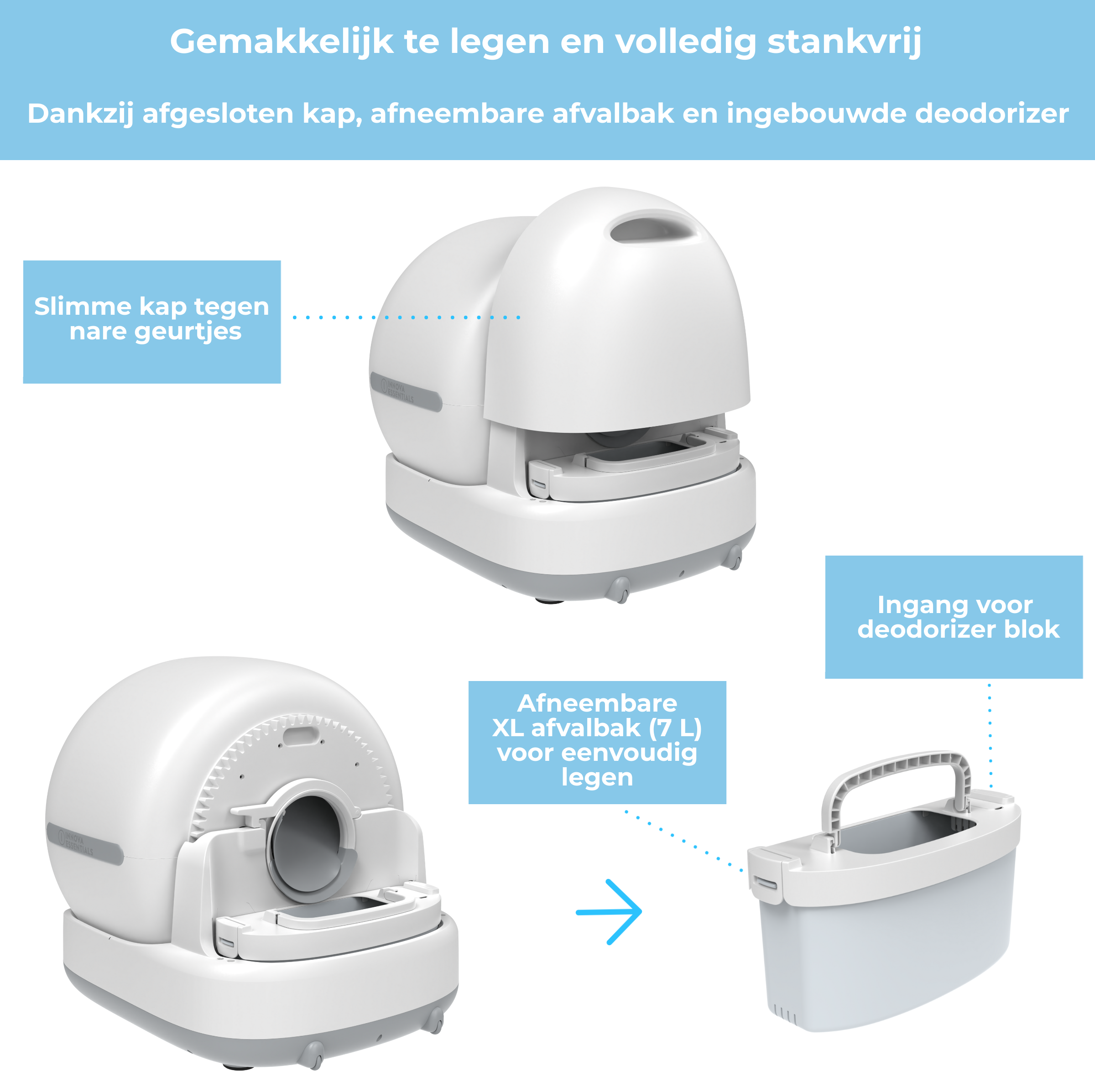 De Innova Essentials LitterBox Pro is een zelfreinigende kattenbak die automatisch klonten en afval verwijdert en opvangt in een afgesloten opvangruimte. Geen dagelijks scheppen meer, een frisser huis en altijd een schone kattenbak voor je kat.