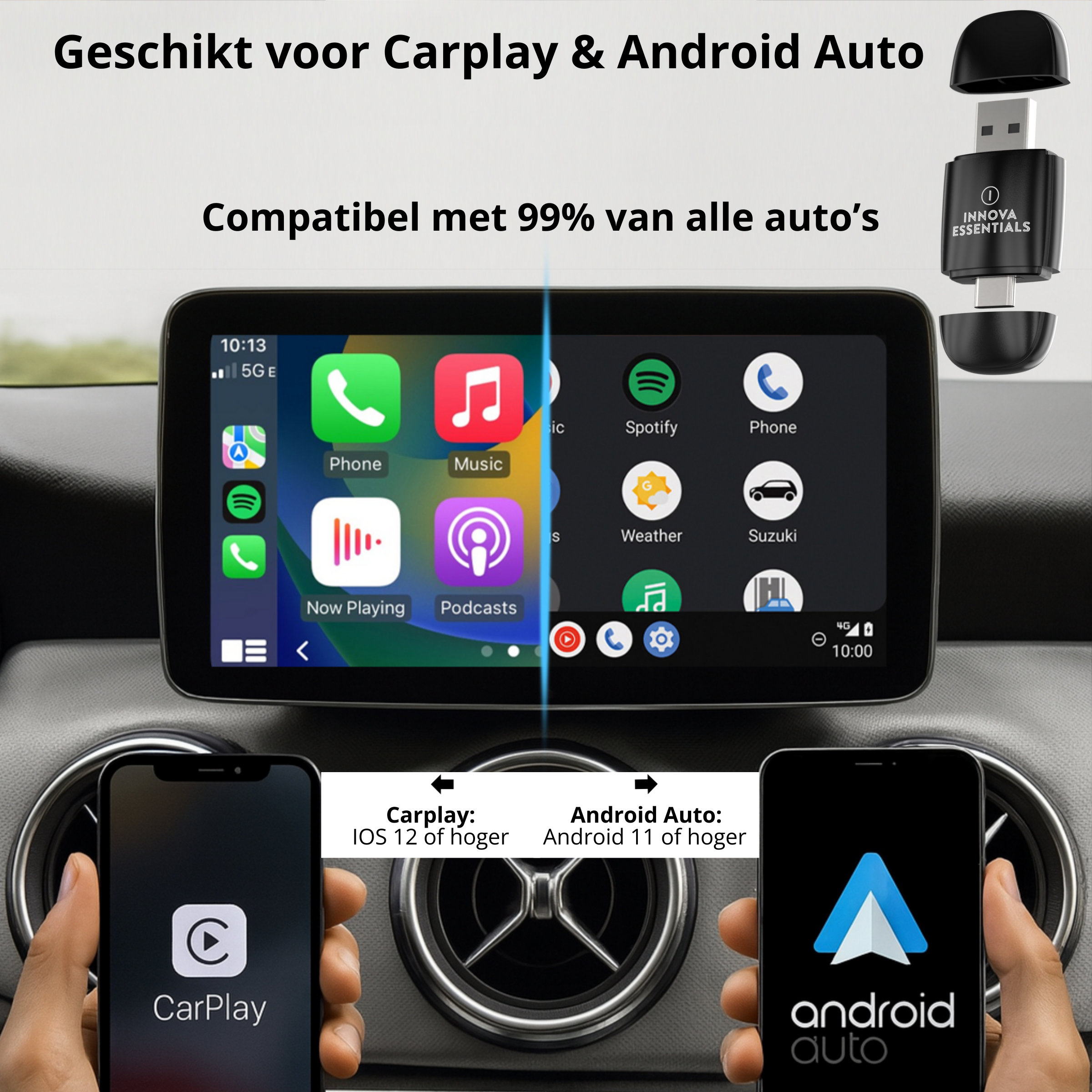Upgrade jouw rijervaring met de Innova 2-in-1 Mini Car Dongle: de kleinste draadloze CarPlay & Android Auto adapter op de markt. Geniet van alle voordelen van draadloos verbinden, zonder gedoe met kabels of tussenstukken. Deze ultra-compacte dongle maakt jouw bestaande infotainmentsysteem direct compatibel met draadloze Apple CarPlay én Android Auto.